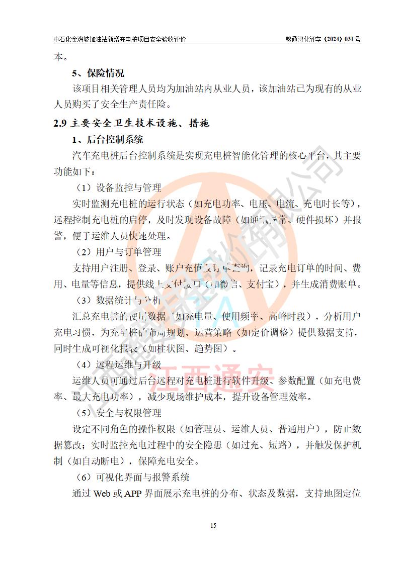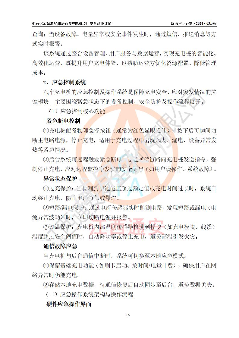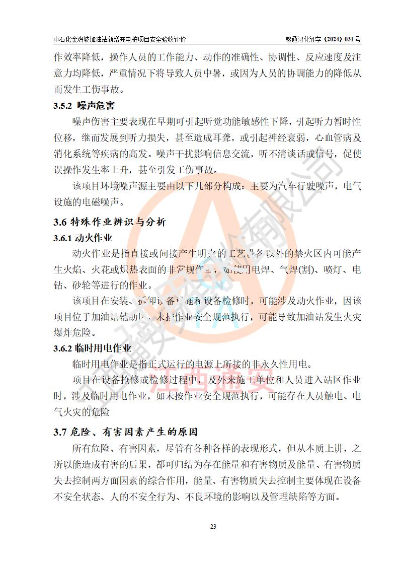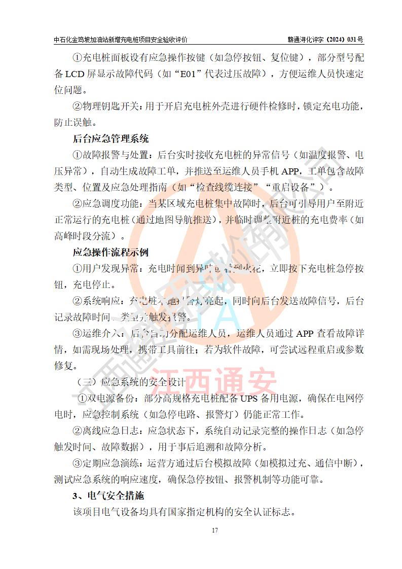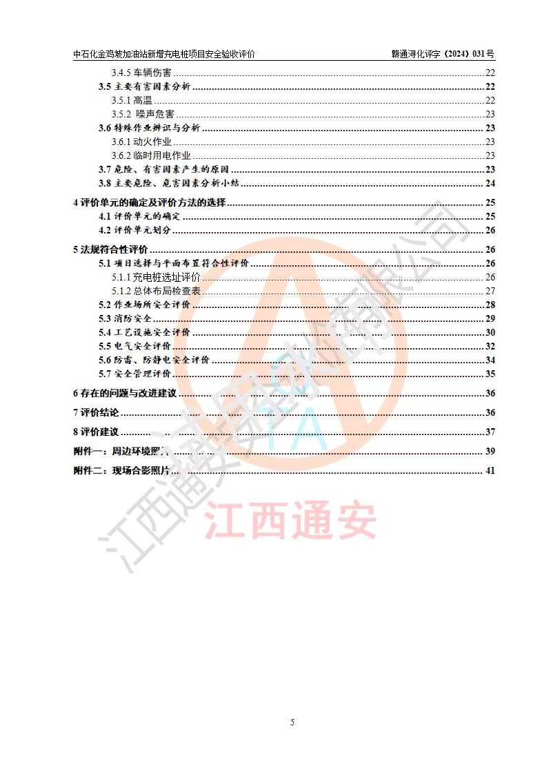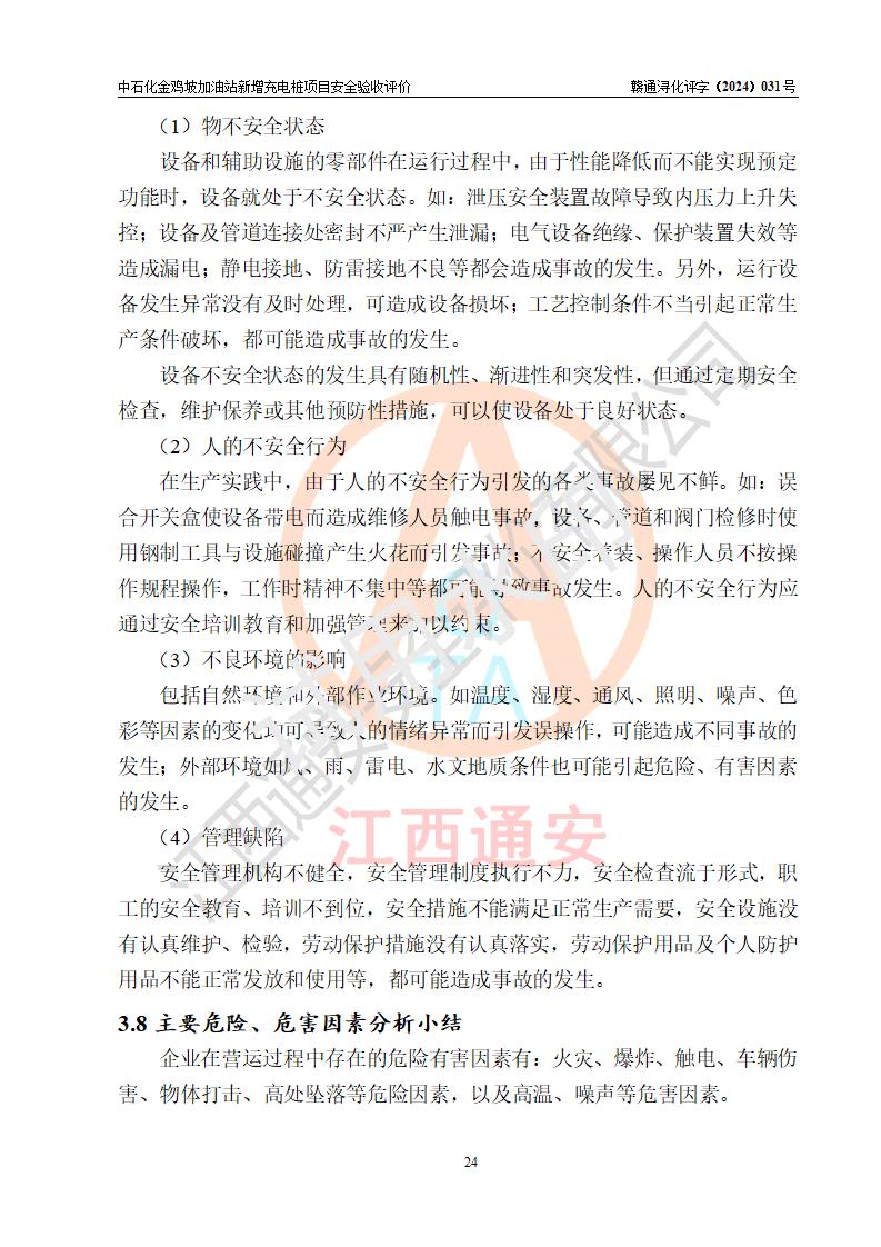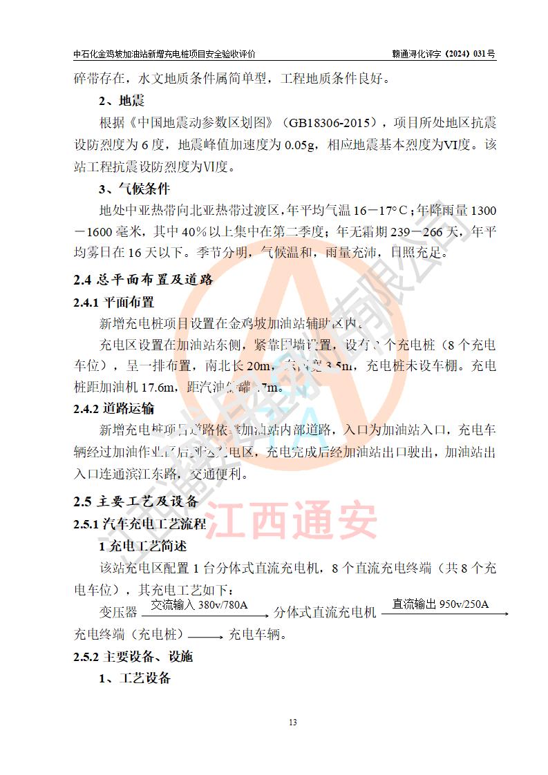 評價結(jié)論 | 中國石化銷售股份有限公司江西九江潯陽石油分公司金雞坡加油站新增充電樁項目涉及的安全條件、安全生產(chǎn)條件、安全生產(chǎn)管理符合《電動汽車充電站設計規(guī)范》、《汽車加油加氣加氫站技術標準》等**有關法規(guī)、標準、規(guī)范要求,能滿足經(jīng)營單位的安全條件,具備項目竣工驗收的條件。 | |||