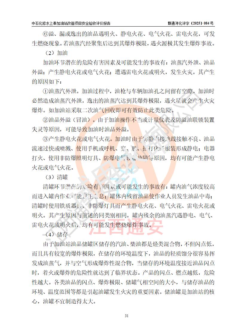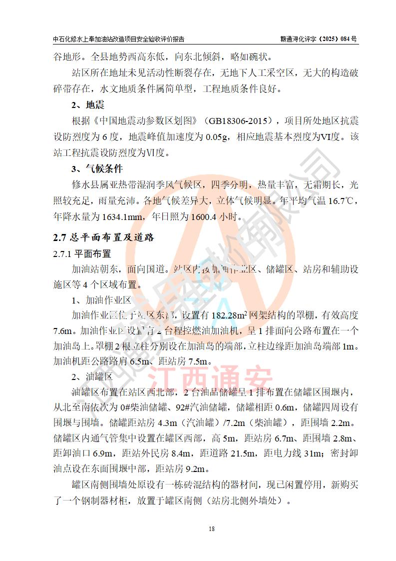 項目簡介 | 中國石化銷售股份有限公司江西九江修水石油分公司上奉加油站(以下簡稱“中石化修水上奉加油站”)是一家專門從事成品油零售經(jīng)營的有限公司分公司(外商投資企業(yè)分公司),經(jīng)營場所位于修水縣上奉鎮(zhèn)觀前村。現(xiàn)有從業(yè)人員3名,其中安全管理人員1人,加油站負(fù)責(zé)人陳小勇。 該站由九江市行政審批局換發(fā)《危險化學(xué)品經(jīng)營許可證》(編號:贛九行審經(jīng)(甲)字[2022]000144),**期限2022年08月26日至2025年08月25日(加油站現(xiàn)已停業(yè));于2023年05月10日取得九江市商務(wù)局頒發(fā)的《成品油零售經(jīng)營批準(zhǔn)證書》(油零售證書第潯0407號)**期至2028年05月09日。 中石化修水上奉加油站占地面積約920m2,站內(nèi)設(shè)置有1臺雙槍和1臺單槍程控燃油加油機及配套的工藝管線,設(shè)有SF雙層儲罐2臺,其中30m3的0#柴油儲罐1臺、30m3的92#汽油儲罐1臺,油品儲罐總?cè)莘e為60m3(折算成汽油為45m3),按現(xiàn)行《汽車加油加氣加氫站技術(shù)標(biāo)準(zhǔn)》對加油站的等級劃分原則,屬三級加油站。 因原有汽油罐距離站外北側(cè)二層民房(三類保護物)安全間距不滿足規(guī)范要求,故將原有罐區(qū)進(jìn)行拆除后原址重建(向南側(cè)移平移2.5米左右),以**與站外二層民房(三類保護物)的安全間距。 改造內(nèi)容為:1、拆除原有油罐區(qū)及配套管線,罐區(qū)拆除后南移重建非承重罐區(qū),利舊2臺30m3SF雙層罐(1柴1汽),并將柴油罐設(shè)置在靠近站外民房側(cè);2、自吸泵、液位儀、量油器、阻火器、機械呼吸閥檢測合格后均利舊,新建非成品操作井;3、新建配套土建設(shè)施、工藝及電氣線路、消防設(shè)施等;4、罐區(qū)開挖需對站房和圍墻進(jìn)行支護。 | |||