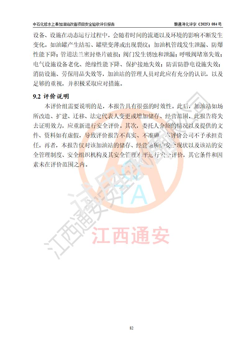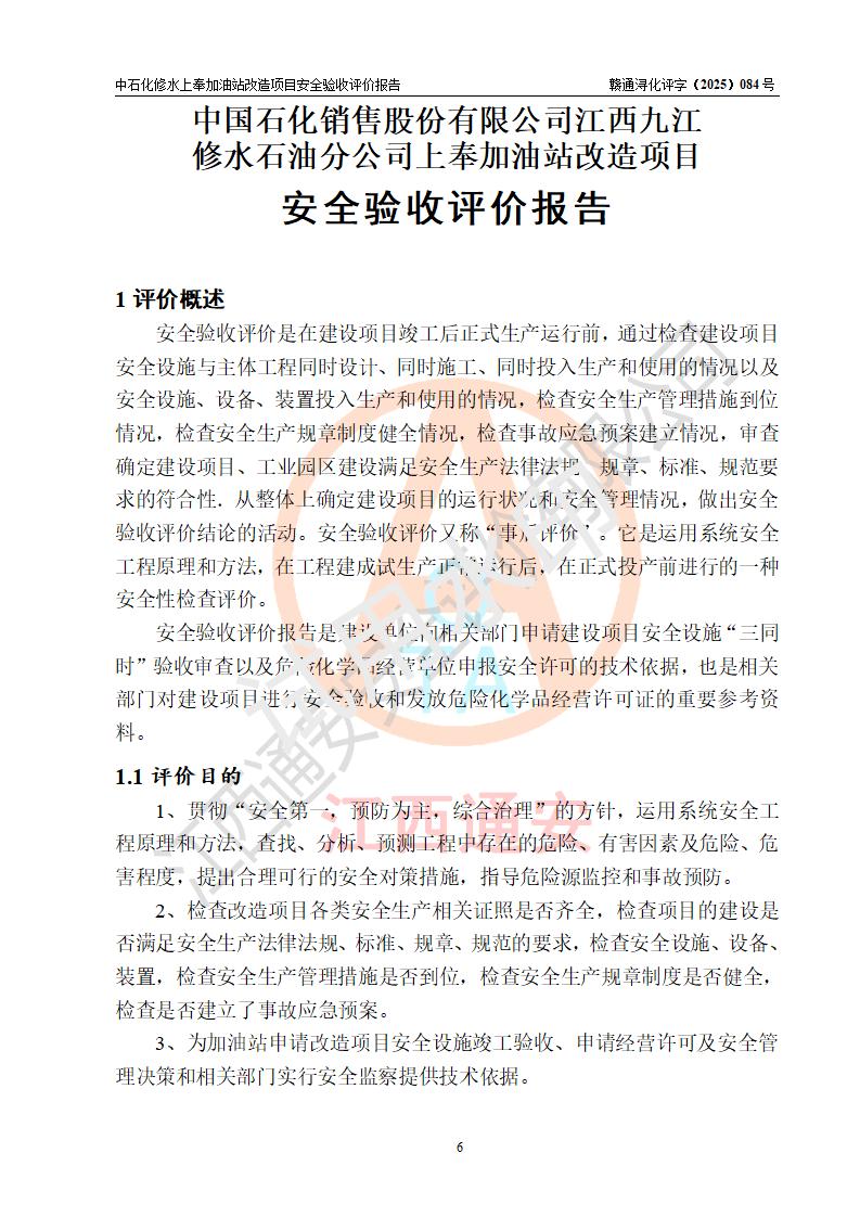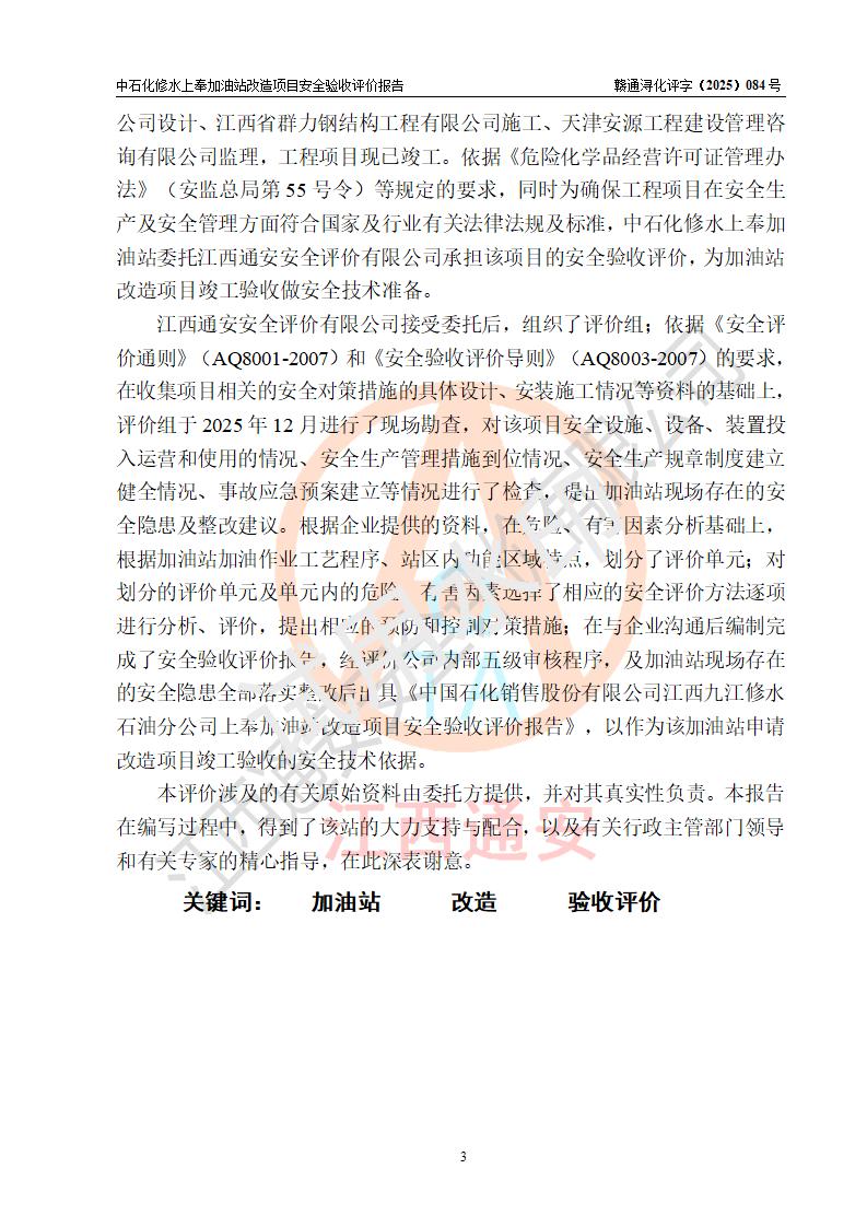 評價報告名稱 | 中國石化銷售股份有限公司江西九江修水石油分公司上奉加油站改造項目安全驗收評價報告 | |||