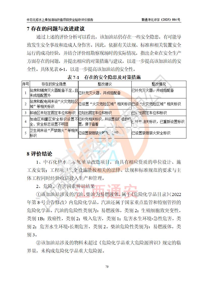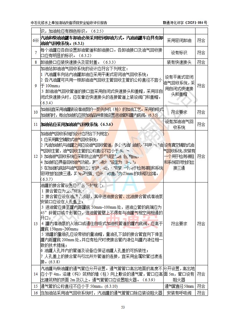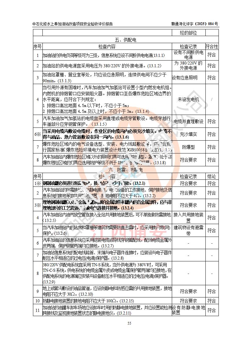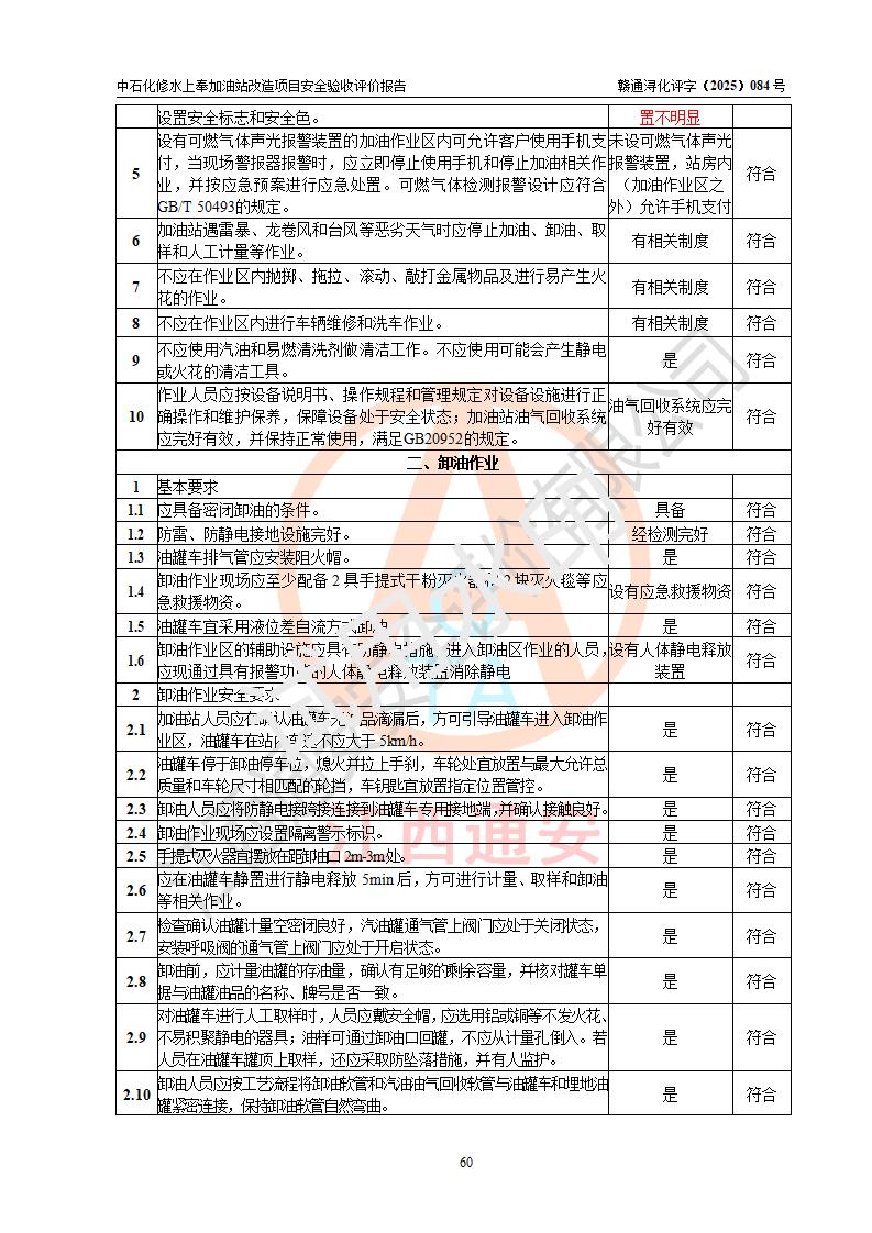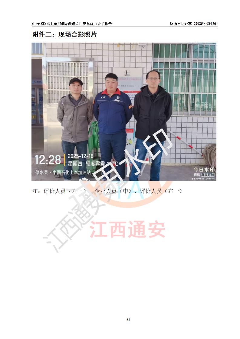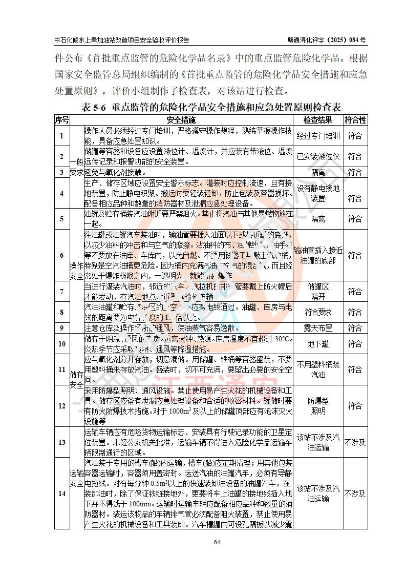 評價結(jié)論 | 中國石化銷售股份有限公司江西九江修水石油分公司上奉加油站改造項目涉及的安全條件、安全生產(chǎn)條件、安全生產(chǎn)管理符合《危險化學(xué)品經(jīng)營許可證管理辦法》、《汽車加油加氣加氫站技術(shù)標(biāo)準(zhǔn)》等**有關(guān)法規(guī)、標(biāo)準(zhǔn)、規(guī)范要求,能滿足成品油零售經(jīng)營單位的安全條件,具備項目竣工驗收的條件。 | |||
