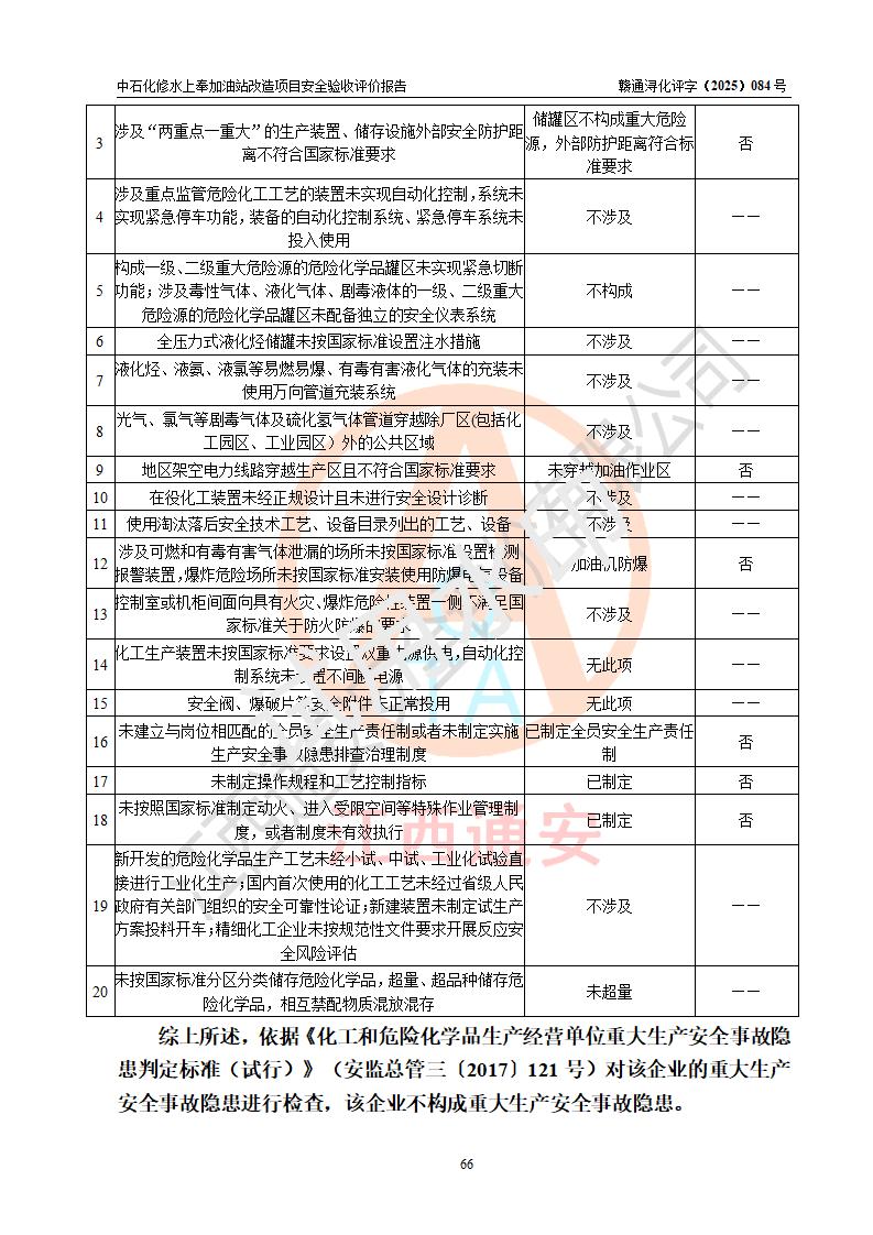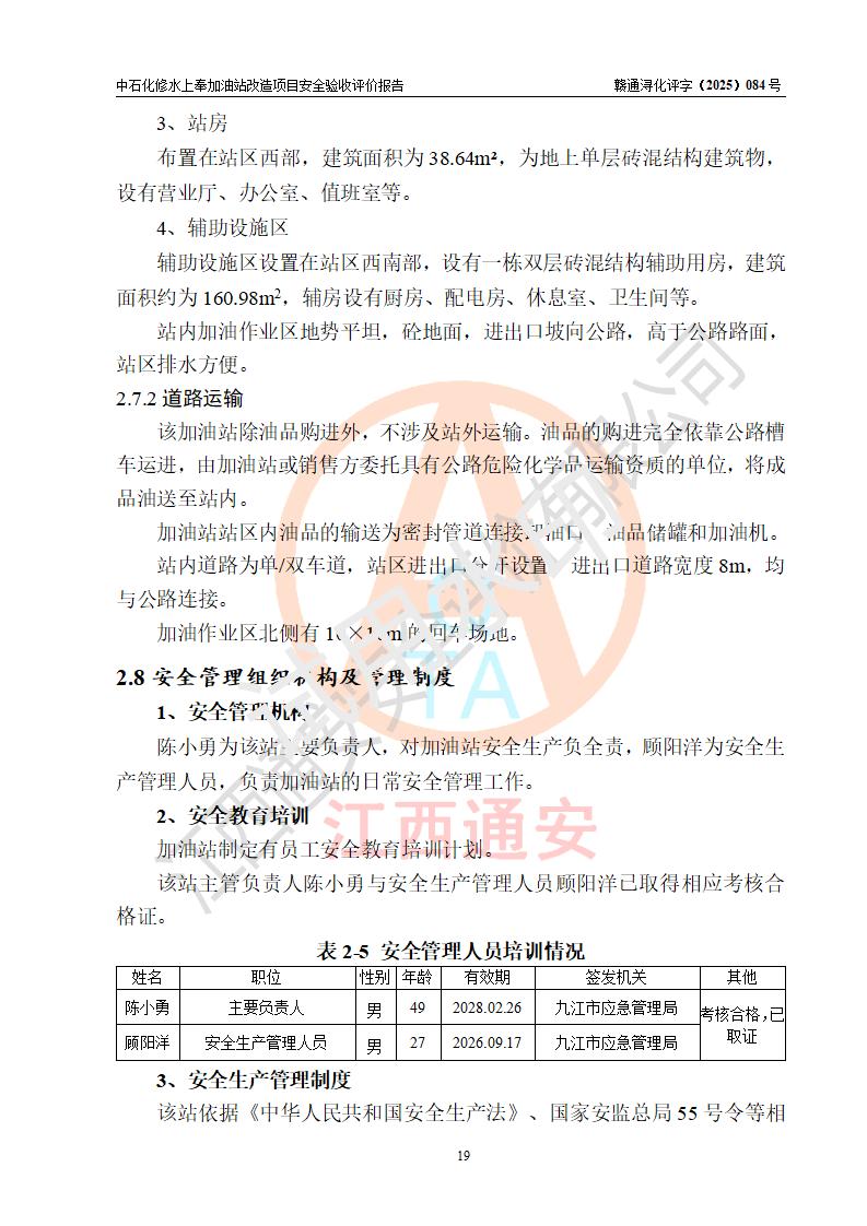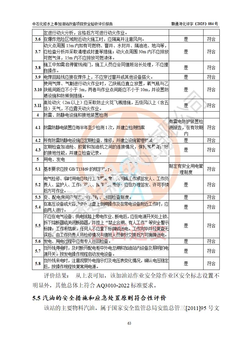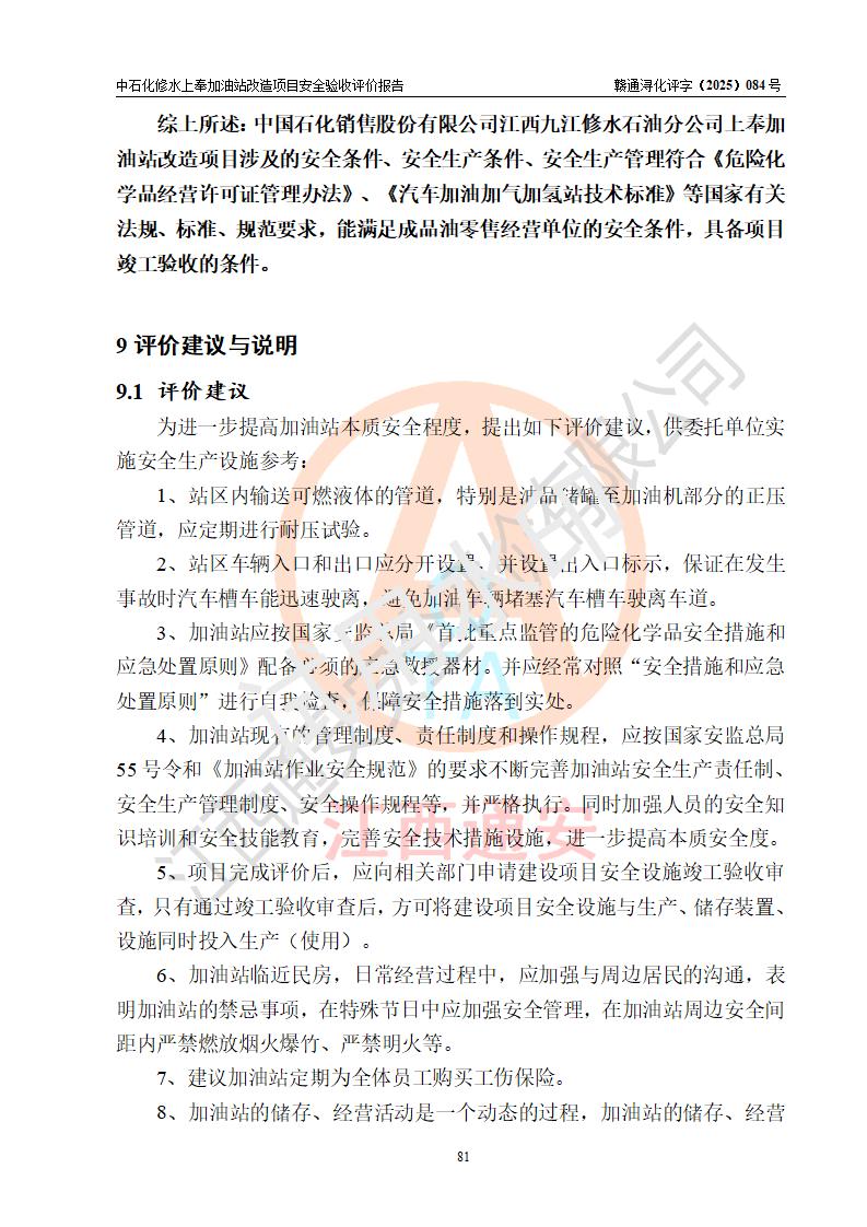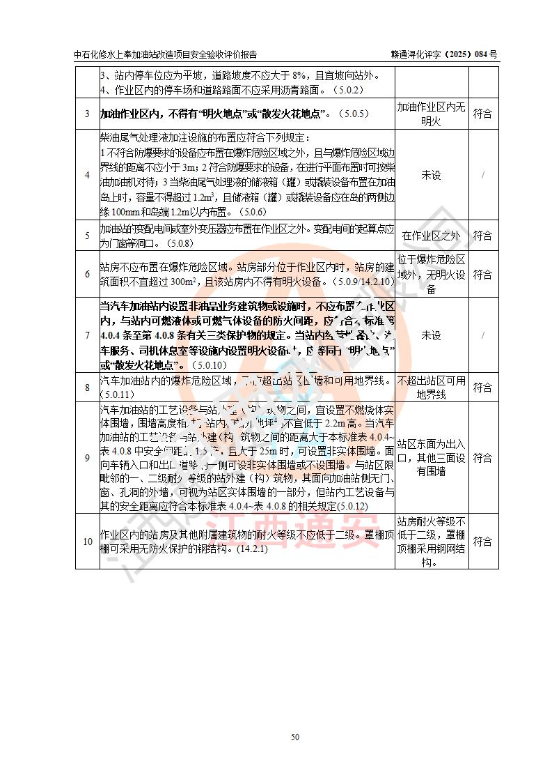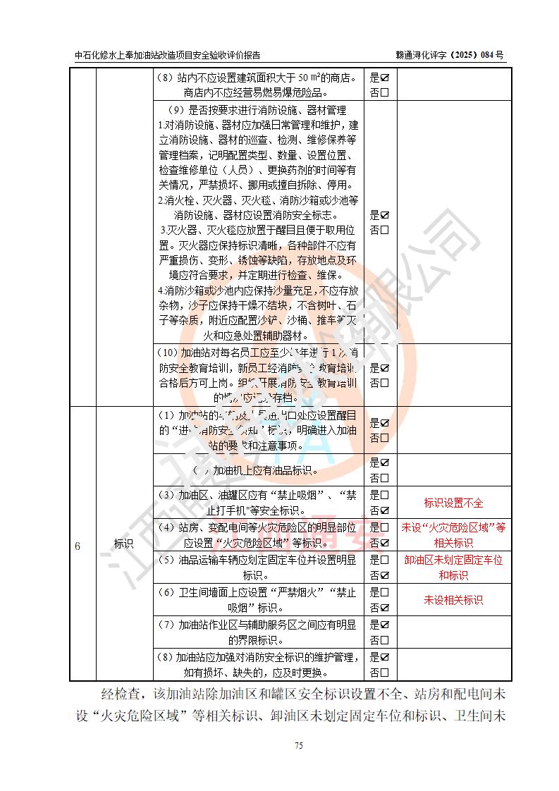 評價結(jié)論 | 中國石化銷售股份有限公司江西九江修水石油分公司上奉加油站改造項目涉及的安全條件、安全生產(chǎn)條件、安全生產(chǎn)管理符合《危險化學(xué)品經(jīng)營許可證管理辦法》、《汽車加油加氣加氫站技術(shù)標(biāo)準(zhǔn)》等**有關(guān)法規(guī)、標(biāo)準(zhǔn)、規(guī)范要求,能滿足成品油零售經(jīng)營單位的安全條件,具備項目竣工驗收的條件。 | |||