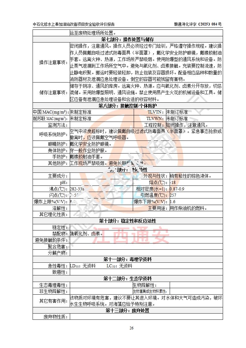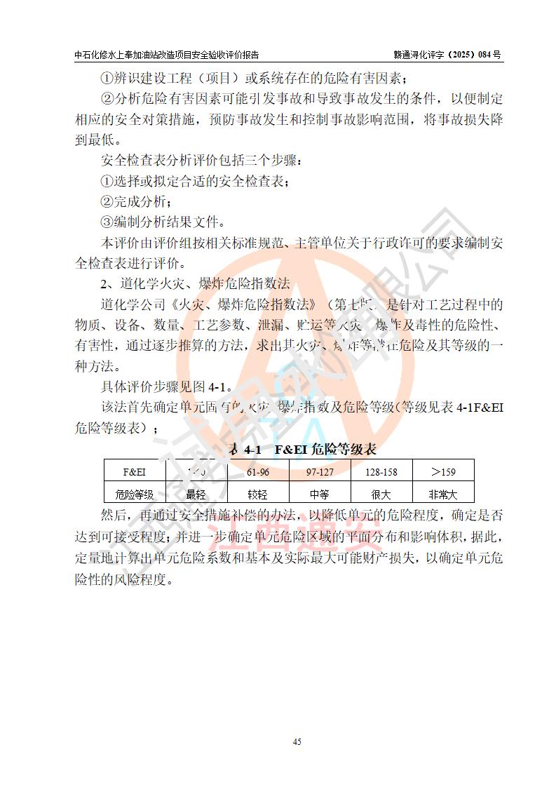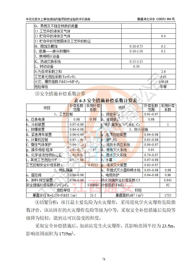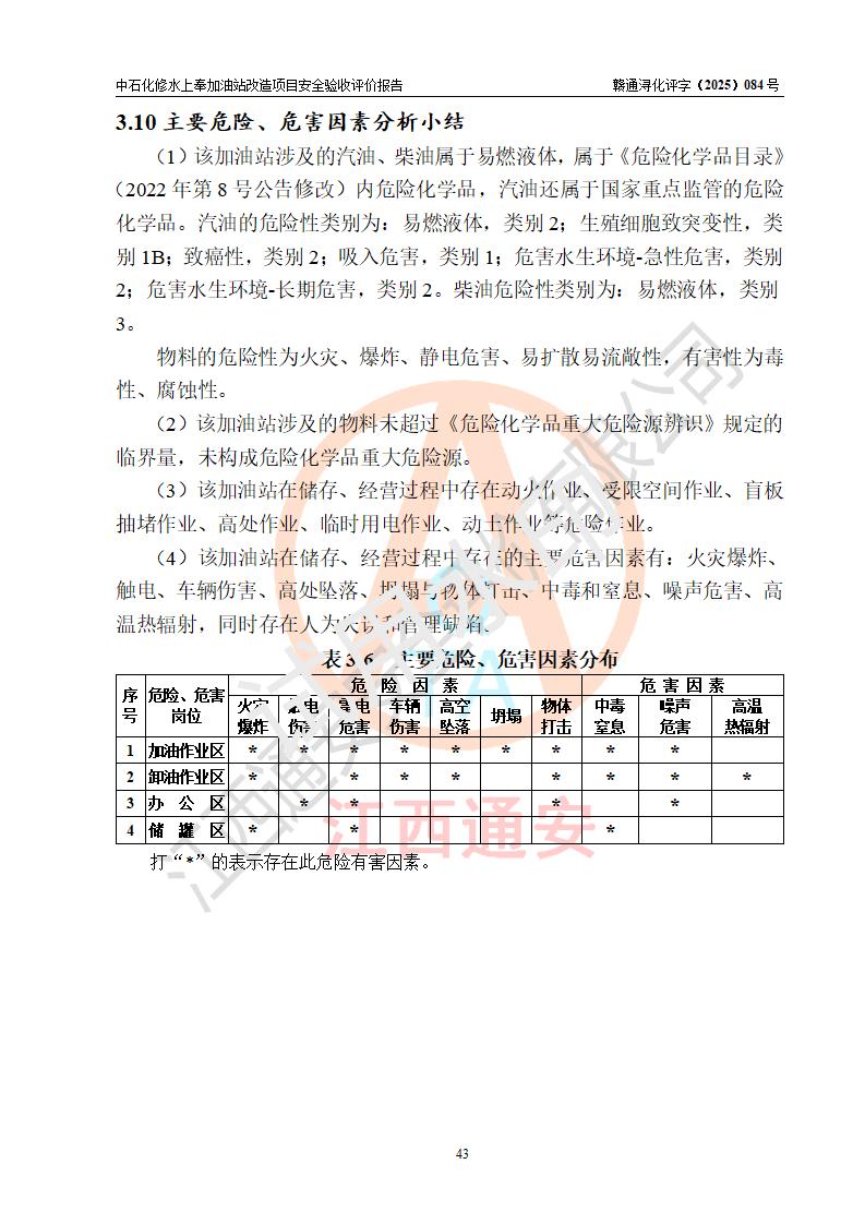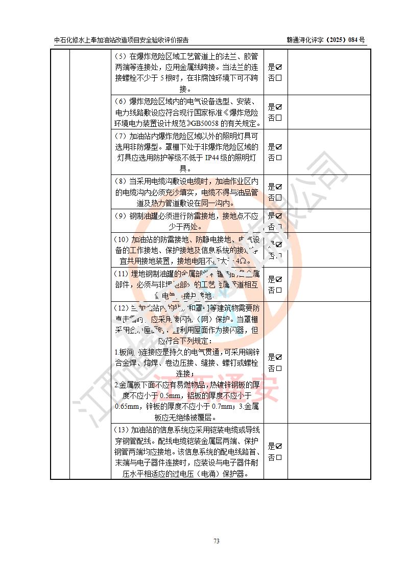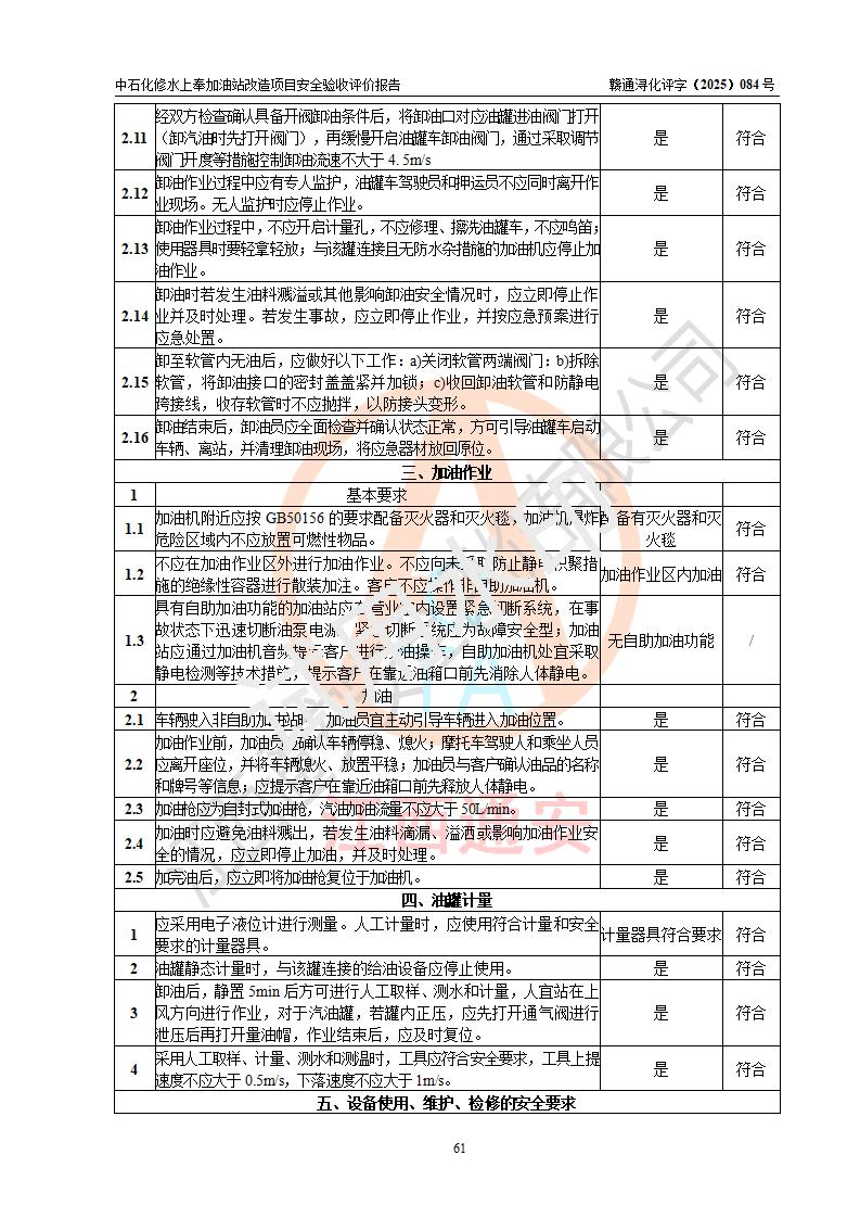 評價結(jié)論 | 中國石化銷售股份有限公司江西九江修水石油分公司上奉加油站改造項目涉及的安全條件、安全生產(chǎn)條件、安全生產(chǎn)管理符合《危險化學(xué)品經(jīng)營許可證管理辦法》、《汽車加油加氣加氫站技術(shù)標(biāo)準(zhǔn)》等**有關(guān)法規(guī)、標(biāo)準(zhǔn)、規(guī)范要求,能滿足成品油零售經(jīng)營單位的安全條件,具備項目竣工驗收的條件。 | |||