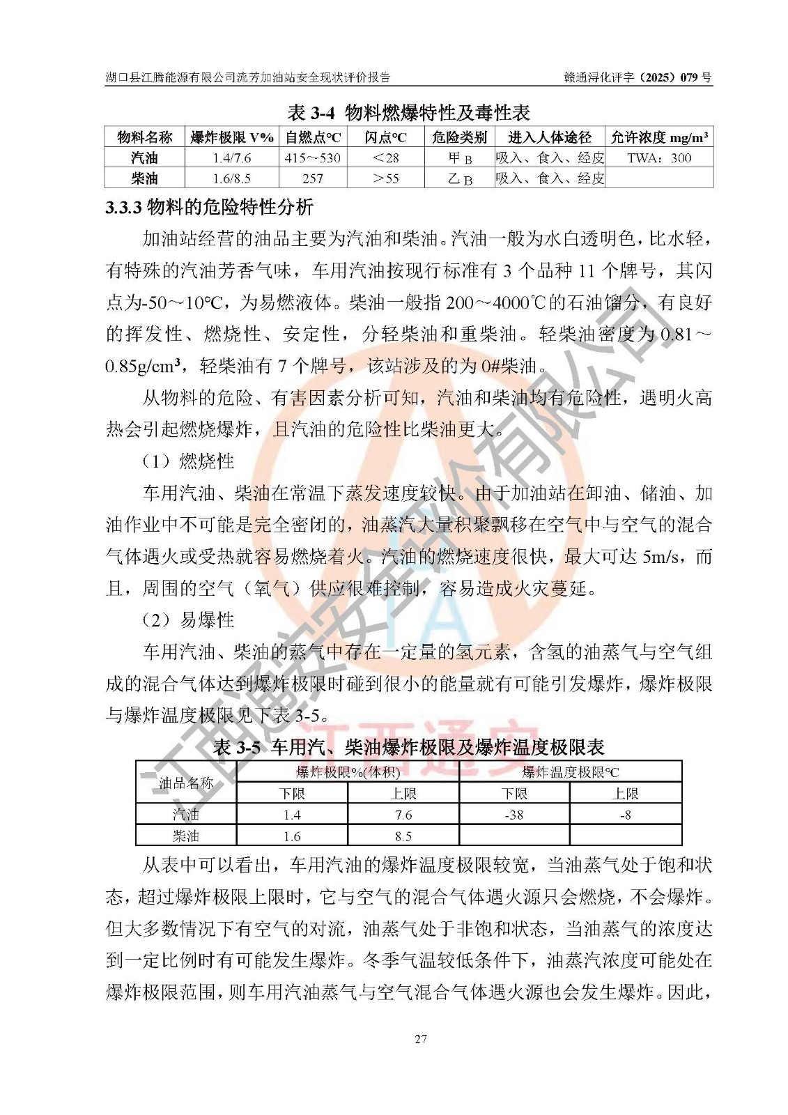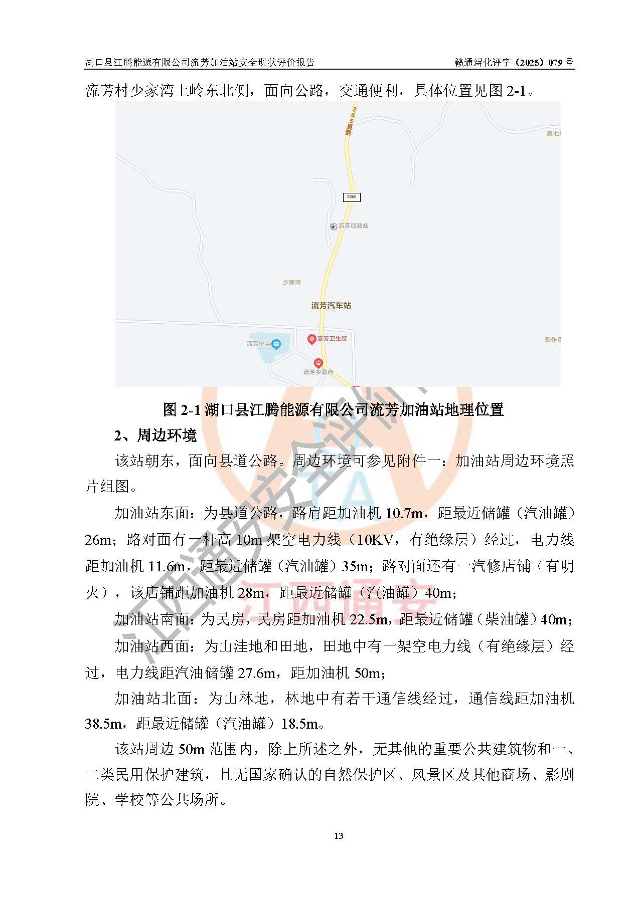 項(xiàng)目簡(jiǎn)介 | 湖口縣江騰能源有限公司流芳加油站是一家專(zhuān)門(mén)從事成品油零售經(jīng)營(yíng)的有限責(zé)任公司分公司(自然人投資或控股),經(jīng)營(yíng)場(chǎng)所位于江西省九江市湖口縣流芳鄉(xiāng)流芳村少家灣上嶺東北側(cè)。現(xiàn)有從業(yè)人員3名,其中安全管理人員1人,加油站負(fù)責(zé)人徐慶生。 該加油站占地面積約618.47m2,站區(qū)內(nèi)設(shè)置有1臺(tái)雙槍和1臺(tái)四槍程控燃油加油機(jī)及配套的工藝管線、設(shè)有SF雙層儲(chǔ)罐2臺(tái),其中30m3的0#柴油儲(chǔ)罐1臺(tái)、30m3的92#汽油儲(chǔ)罐1臺(tái),油品儲(chǔ)罐總?cè)莘e為60m3(折算成汽油為45m3),按現(xiàn)行《汽車(chē)加油加氣加氫站技術(shù)標(biāo)準(zhǔn)》對(duì)加油站的等級(jí)劃分原則,屬三級(jí)加油站。 該站由九江市行政審批局換發(fā)《危險(xiǎn)化學(xué)品經(jīng)營(yíng)許可證》(證號(hào):36040013202500148),**期限2022年12月24日至2025年12月23日。 | |||